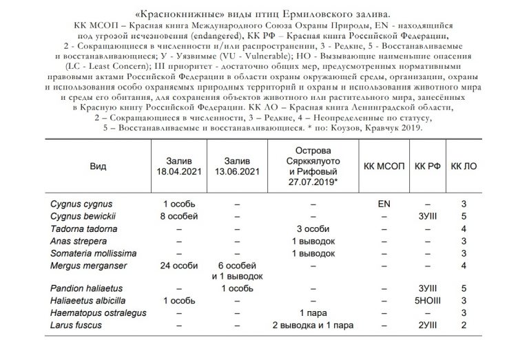 Ермиловский залив в настоящее время является одним из природных уголков Финского залива, который служит полноценным местом для гнездования и миграционных остановок водоплавающих птиц, мигрирующих Беломоро-Балтийским пролётным путём. В ходе исследования встречены один вид, имеющий статус «находящийся под угрозой