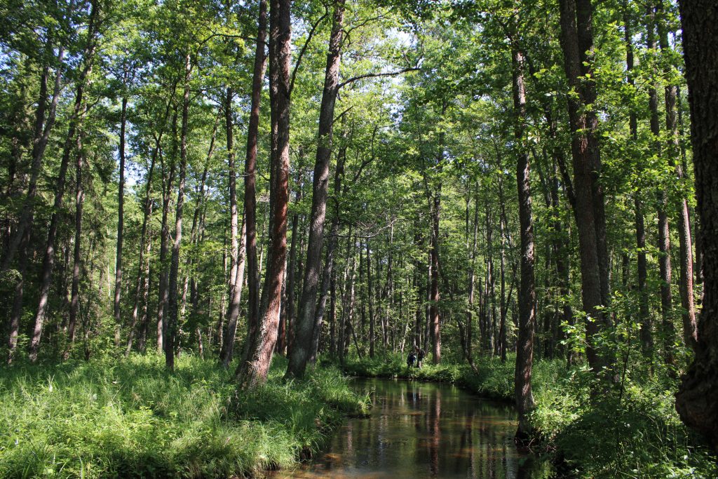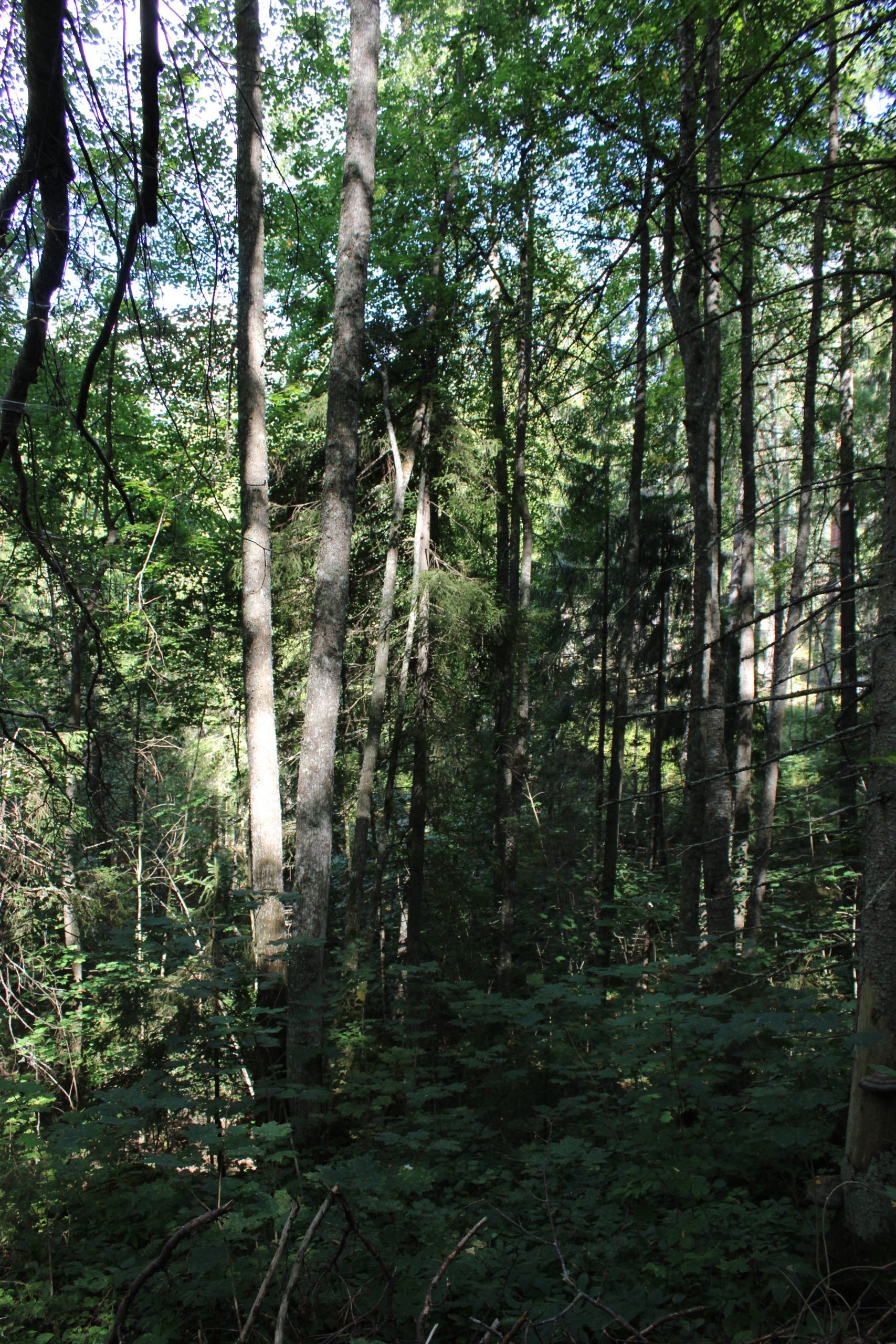 В верхнем течении реки у подножия холмов Липовых гор в местах выходов грунтовых вод наряду с заболоченными ельниками и черноольшаниками встречаются богатые по видовому составу елово-широколиственные леса с участием черной ольхи. В состав древесного яруса наряду с елью входят Ulmus glabra (вяз шершавый) (рис. 11), Tilia cordata (липа сердцевидная) (рис. 12), Acer platanoides (клен платановидный). В густом подлеске представлены Lonicera xylosteum (жимолость обыкновенная). Padus avium (черемуха обыкновенная), Corylus avellana (лещина обыкновенная), Daphne mezereum (волчеягодник обыкновенный) и др. Травяно-кустарничковый ярус включает виды различных эколого-ценотических групп, требовательных как к богатству, так и к постоянной влажности почв: Dryopteris expansa (щитовник распростертый), Thelypteris palustris (телиптерис болотный), Poa remota (мятлик расставленный), Urtica galeopsifolia (крапива пикульниколистная), Geranium robertianum (герань Роберта), Galium odoratum (подмаренник душистый), Chrysosplenium alternifolium (селезеночник очереднолистный) и др.